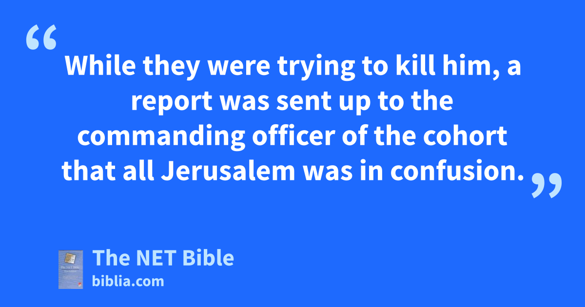 21:15 After these days we got ready54 and started up55 to Jerusalem. 21:16 Some of the disciples from Caesarea56 came along with us too, and brought us to the house57 of Mnason of Cyprus, a disciple from the earliest times,58 with whom we were to stay. 21:17 When we arrived in Jerusalem, the brothers welcomed us gladly.59 21:18 The next day Paul went in with us to see James, and all the elders were there.60 21:19 When Paul61 had greeted them, he began to explain62 in detail63 what God64 had done among the Gentiles through his ministry. 21:20 When they heard this, they praised65 God. Then they said to him, “You see, brother, how many thousands of Jews66 there are who have believed, and they are all ardent observers67 of the law.68 21:21 They have been informed about you—that you teach all the Jews now living69 among the Gentiles to abandon70 Moses, telling them not to circumcise their children71 or live72 according to our customs. 21:22 What then should we do? They will no doubt73 hear that you have come. 21:23 So do what74 we tell you: We have four men75 who have taken76 a vow;77 21:24 take them and purify78 yourself along with them and pay their expenses,79 so that they may have their heads shaved.80 Then81 everyone will know there is nothing in what they have been told82 about you, but that you yourself live in conformity with83 the law.84 21:25 But regarding the Gentiles who have believed, we have written a letter, having decided85 that they should avoid86 meat that has been sacrificed to idols87 and blood and what has been strangled88 and sexual immorality.” 21:26 Then Paul took the men the next day,89 and after he had purified himself90 along with them, he went to the temple and gave notice91 of the completion of the days of purification,92 when93 the sacrifice would be offered for each94 of them. 21:27 When the seven days were almost over,95 the Jews from the province of Asia96 who had seen him in the temple area97 stirred up the whole crowd98 and seized99 him, 21:28 shouting, “Men of Israel,100 help! This is the man who teaches everyone everywhere against our people, our law,101 and this sanctuary!102 Furthermore103 he has brought Greeks into the inner courts of the temple104 and made this holy place ritually unclean!”105 21:29 (For they had seen Trophimus the Ephesian in the city with him previously, and106 they assumed Paul had brought him into the inner temple courts.)107 21:30 The whole city was stirred up,108 and the people rushed together.109 They seized110 Paul and dragged him out of the temple courts,111 and immediately the doors were shut. 21:31 While they were trying112 to kill him, a report113 was sent up114 to the commanding officer115 of the cohort116 that all Jerusalem was in confusion.117 21:32 He118 immediately took119 soldiers and centurions120 and ran down to the crowd.121 When they saw122 the commanding officer123 and the soldiers, they stopped beating124 Paul. 21:33 Then the commanding officer125 came up and arrested126 him and ordered him to be tied up with two chains;127 he128 then asked who he was and what129 he had done. 21:34 But some in the crowd shouted one thing, and others something else,130 and when the commanding officer131 was unable132 to find out the truth133 because of the disturbance,134 he ordered Paul135 to be brought into the barracks.136 21:35 When he came to the steps, Paul137 had to be carried138 by the soldiers because of the violence139 of the mob, 21:36 for a crowd of people140 followed them,141 screaming, “Away with him!” 21:37 As Paul was about to be brought into the barracks,142 he said143 to the commanding officer,144 “May I say145 something to you?” The officer146 replied,147 “Do you know Greek?148 21:38 Then you’re not that Egyptian who started a rebellion149 and led the four thousand men of the ‘Assassins’150 into the wilderness151 some time ago?”152 21:39 Paul answered,153 “I am a Jew154 from Tarsus in Cilicia, a citizen of an important city.155 Please156 allow me to speak to the people.” 21:40 When the commanding officer157 had given him permission,158 Paul stood159 on the steps and gestured160 to the people with his hand. When they had become silent,161 he addressed162 them in Aramaic,163