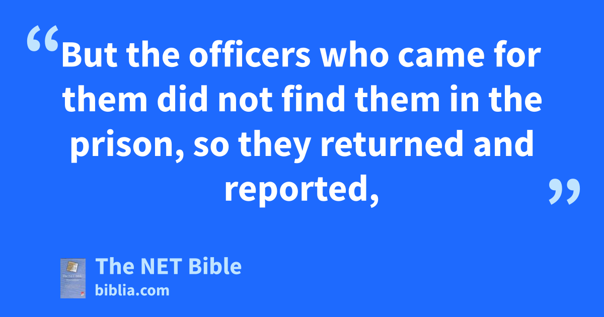 Now when the high priest and those who were with him arrived, they summoned the Sanhedrin48—that is, the whole high council49 of the Israelites50—and sent to the jail to have the apostles51 brought before them.52 5:22 But the officers53 who came for them54 did not find them in the prison, so they returned and reported,55 5:23 “We found the jail locked securely and the guards standing at the doors, but when we opened them,56 we found no one inside.” 5:24 Now when the commander57 of the temple guard58 and the chief priests heard this report,59 they were greatly puzzled concerning it,60 wondering what this could61 be. 5:25 But someone came and reported to them, “Look! The men you put in prison are standing in the temple courts62 and teaching63 the people!” 5:26 Then the commander64 of the temple guard65 went with the officers66 and brought the apostles67 without the use of force68 (for they were afraid of being stoned by the people).69