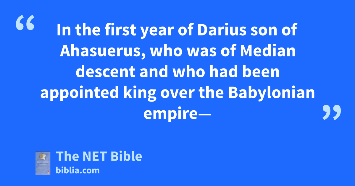9:1 In the first year of Darius1 son of Ahasuerus,2 who was of Median descent and who had been3 appointed king over the Babylonian4 empire—9:2 in the first year of his reign5 I, Daniel, came to understand from the sacred books6 that, according to the word of the LORD7 disclosed to the prophet Jeremiah, the years for the fulfilling of the desolation of Jerusalem8 were seventy in number. 9:3 So I turned my attention9 to the Lord God10 to implore him by prayer and requests, with fasting, sackcloth, and ashes.11 9:4 I prayed to the LORD my God, confessing in this way: