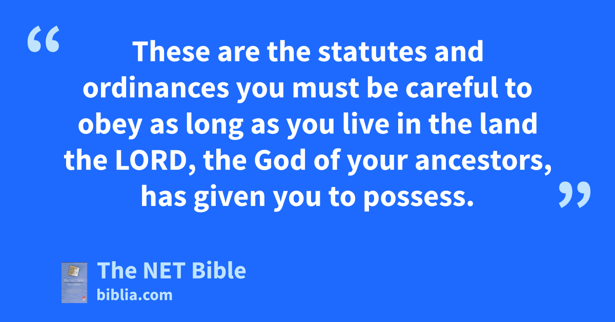 12:1 These are the statutes and ordinances you must be careful to obey as long as you live in the land the Lord, the God of your ancestors,1 has given you to possess.2 12:2 You must by all means destroy3 all the places where the nations you are about to dispossess worship their gods—on the high mountains and hills and under every leafy tree.4 12:3 You must tear down their altars, shatter their sacred pillars,5 burn up their sacred Asherah poles,6 and cut down the images of their gods; you must eliminate their very memory from that place. 12:4 You must not worship the Lord your God the way they worship. 12:5 But you must seek only the place he7 chooses from all your tribes to establish his name as his place of residence,8 and you must go there. 12:6 And there you must take your burnt offerings, your sacrifices, your tithes, the personal offerings you have prepared,9 your votive offerings, your freewill offerings, and the firstborn of your herds and flocks. 12:7 Both you and your families10 must feast there before the Lord your God and rejoice in all the output of your labor with which he11 has blessed you. 12:8 You must not do like we are doing here today, with everyone12 doing what seems best to him, 12:9 for you have not yet come to the final stop13 and inheritance the Lord your God is giving you. 12:10 When you do go across the Jordan River14 and settle in the land he15 is granting you as an inheritance and you find relief from all the enemies who surround you, you will live in safety.16 12:11 Then you must come to the place the Lord your God chooses for his name to reside, bringing17 everything I am commanding you—your burnt offerings, sacrifices, tithes, the personal offerings you have prepared,18 and all your choice votive offerings which you devote to him.19 12:12 You shall rejoice in the presence of the Lord your God, along with your sons, daughters, male and female servants, and the Levites in your villages20 (since they have no allotment or inheritance with you).21 12:13 Make sure you do not offer burnt offerings in any place you wish, 12:14 for you may do so22 only in the place the Lord chooses in one of your tribal areas—there you may do everything I am commanding you.23