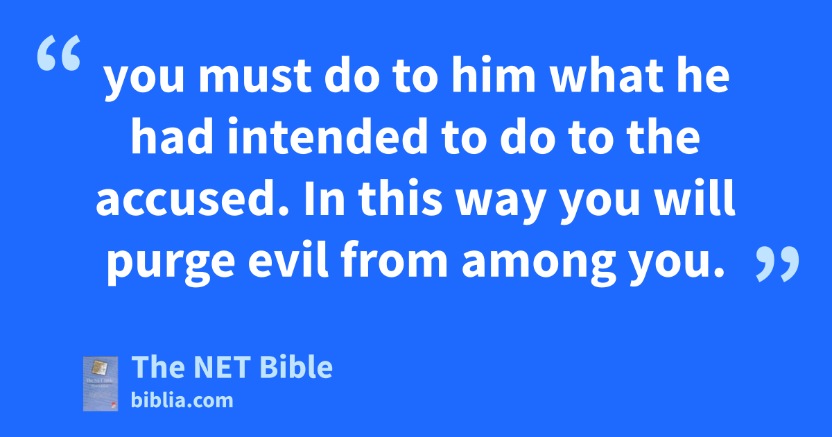 19:15 A single witness may not testify31 against another person for any trespass or sin that he commits. A matter may be legally established32 only on the testimony of two or three witnesses. 19:16 If a false33 witness testifies against another person and accuses him of a crime,34 19:17 then both parties to the controversy must stand before the Lord, that is, before the priests and judges35 who will be in office in those days. 19:18 The judges will thoroughly investigate the matter, and if the witness should prove to be false and to have given false testimony against the accused,36 19:19 you must do to him what he had intended to do to the accused. In this way you will purge37 evil from among you. 19:20 The rest of the people will hear and become afraid to keep doing such evil among you. 19:21 You must not show pity; the principle will be a life for a life, an eye for an eye, a tooth for a tooth, a hand for a hand, and a foot for a foot.38