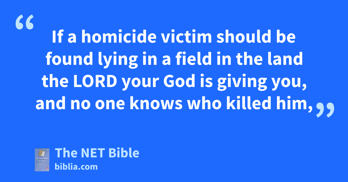 21:1 If a homicide victim1 should be found lying in a field in the land the Lord your God is giving you,2 and no one knows who killed3 him, 21:2 your elders and judges must go out and measure how far it is to the cities in the vicinity of the corpse.4 21:3 Then the elders of the city nearest to the corpse5 must take from the herd a heifer that has not been worked—that has never pulled with the yoke—21:4 and bring the heifer down to a wadi with flowing water,6 to a valley that is neither plowed nor sown.7 There at the wadi they are to break the heifer’s neck. 21:5 Then the Levitical priests8 will approach (for the Lord your God has chosen them to serve him and to pronounce blessings in his name,9 and to decide10 every judicial verdict11) 21:6 and all the elders of that city nearest the corpse12 must wash their hands over the heifer whose neck was broken in the valley.13 21:7 Then they must proclaim, “Our hands have not spilled this blood, nor have we14 witnessed the crime.15 21:8 Do not blame16 your people Israel whom you redeemed, O Lord, and do not hold them accountable for the bloodshed of an innocent person.”17 Then atonement will be made for the bloodshed. 21:9 In this manner you will purge out the guilt of innocent blood from among you, for you must do what is right before18 the Lord.