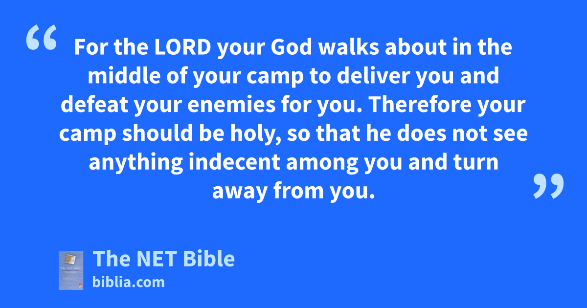 23:12 You are to have a place outside the camp to serve as a latrine.17 23:13 You must have a spade among your other equipment and when you relieve yourself18 outside you must dig a hole with the spade19 and then turn and cover your excrement.20 23:14 For the Lord your God walks about in the middle of your camp to deliver you and defeat21 your enemies for you. Therefore your camp should be holy, so that he does not see anything indecent22 among you and turn away from you.