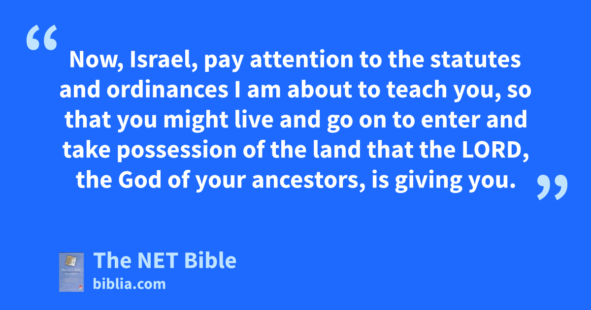 4:1 Now, Israel, pay attention to the statutes and ordinances1 I am about to teach you, so that you might live and go on to enter and take possession of the land that the Lord, the God of your ancestors,2 is giving you. 4:2 Do not add a thing to what I command you nor subtract from it, so that you may keep the commandments of the Lord your God that I am delivering to3 you. 4:3 You have witnessed what the Lord did at Baal Peor,4 how he5 eradicated from your midst everyone who followed Baal Peor.6 4:4 But you who remained faithful to the Lord your God are still alive to this very day, every one of you. 4:5 Look! I have taught you statutes and ordinances just as the Lord my God told me to do, so that you might carry them out in7 the land you are about to enter and possess. 4:6 So be sure to do them, because this will testify of your wise understanding8 to the people who will learn of all these statutes and say, “Indeed, this great nation is a very wise9 people.” 4:7 In fact, what other great nation has a god so near to them like the Lord our God whenever we call on him? 4:8 And what other great nation has statutes and ordinances as just10 as this whole law11 that I am about to share with12 you today?