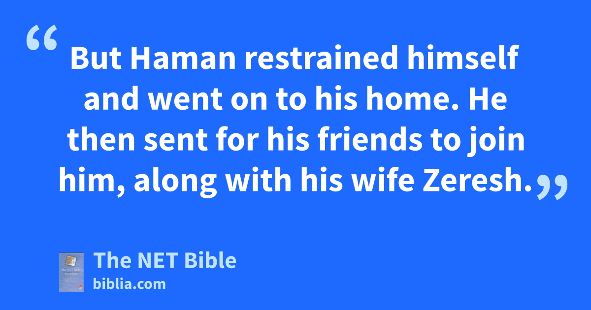 5:9 Now Haman went forth that day pleased and very much encouraged.12 But when Haman saw Mordecai at the king’s gate, and he did not rise nor tremble in his presence,13 Haman was filled with rage toward Mordecai. 5:10 But Haman restrained himself and went on to his home.