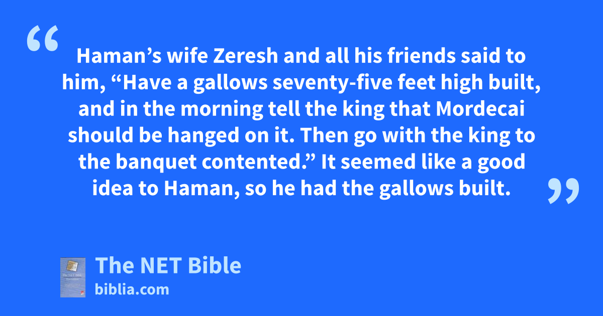 5:14 Haman’s19 wife Zeresh and all his friends said to him, “Have a gallows seventy-five feet20 high built, and in the morning tell the king that Mordecai should be hanged on it. Then go with the king to the banquet contented.”21