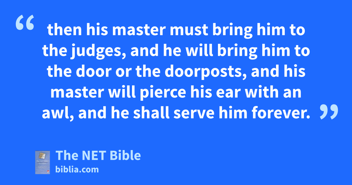 21:2 2 “If you buy3 a Hebrew servant,4 he is to serve you for six years, but in the seventh year he will go out free5 without paying anything.6 21:3 If he came7 in by himself8 he will go out by himself; if he had9 a wife when he came in, then his wife will go out with him. 21:4 If his master gave10 him a wife, and she bore sons or daughters, the wife and the children will belong to her master, and he will go out by himself. 21:5 But if the servant should declare,11 ‘I love my master, my wife, and my children; I will not go out12 free,’ 21:6 then his master must bring him to the judges,13 and he will bring him to the door or the doorposts, and his master will pierce his ear with an awl, and he shall serve him forever.14