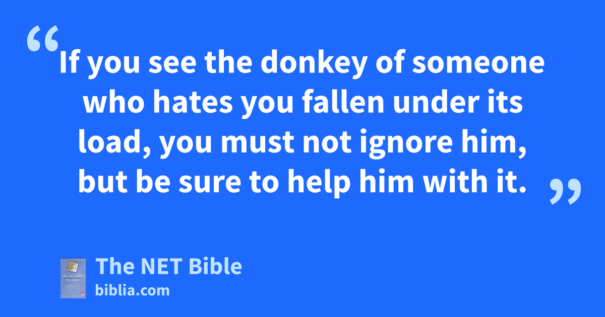 23:4 “If you encounter11 your enemy’s ox or donkey wandering off, you must by all means return12 it to him. 23:5 If you see the donkey of someone who hates you fallen under its load, you must not ignore him,13 but be sure to help14 him with it.15