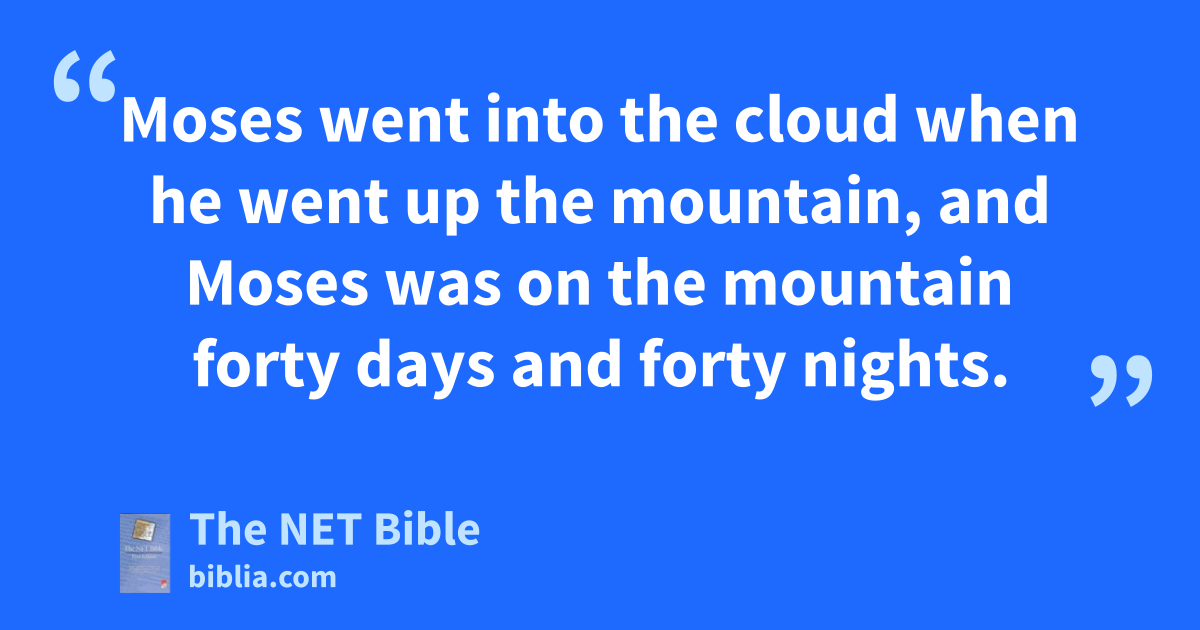 24:15 Moses went up the mountain, and the cloud covered the mountain. 24:16 The glory of the Lord resided41 on Mount Sinai, and the cloud covered it for six days.42 On the seventh day he called to Moses from within the cloud. 24:17 Now the appearance of the glory of the Lord was like a devouring fire on the top of the mountain in plain view43 of the people. 24:18 Moses went into the cloud when he went up44 the mountain, and Moses was on the mountain forty days and forty nights.45