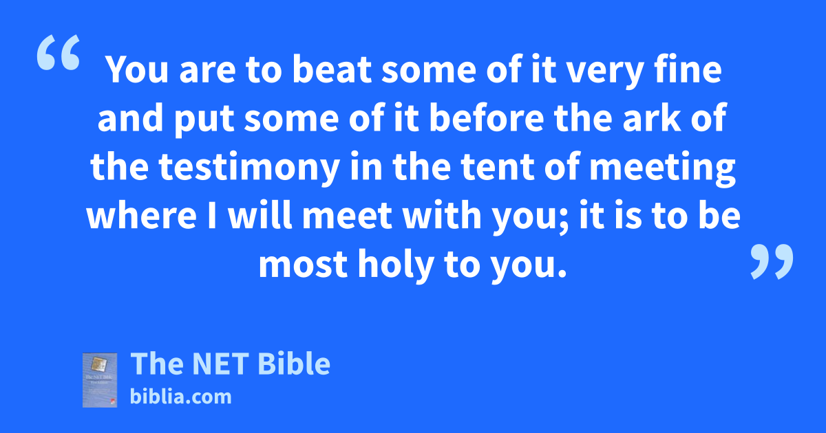30:34 The Lord said to Moses: “Take71 spices, gum resin,72 onycha,73 galbanum,74 and pure frankincense75 of equal amounts76 30:35 and make it into an incense,77 a perfume,78 the work of a perfumer. It is to be finely ground,79 and pure and sacred. 30:36 You are to beat some of it very fine and put some of it before the ark of the testimony in the tent of meeting where I will meet with you; it is to be most holy to you. 30:37 And the incense that you are to make, you must not make for yourselves using the same recipe; it is to be most holy to you, belonging to the Lord. 30:38 Whoever makes anything like it, to use as perfume,80 will be cut off from his people.”