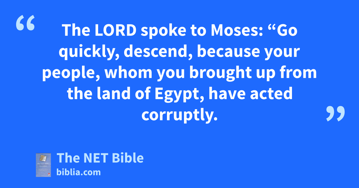 32:7 The Lord spoke to Moses: “Go quickly, descend,23 because your24 people, whom you brought up from the land of Egypt, have acted corruptly. 32:8 They have quickly turned aside25 from the way that I commanded them—they have made for themselves a molten calf and have bowed down to it and sacrificed to it and said, ‘These are your gods, O Israel, which brought you up from the land of Egypt.’ ”
