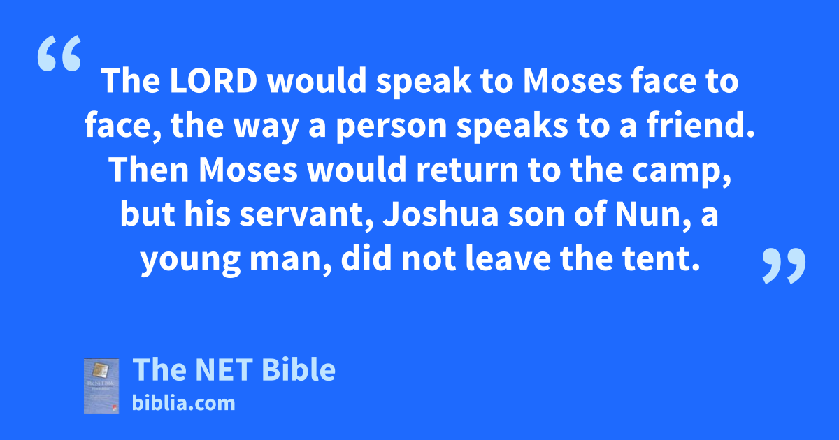 33:8 And when Moses went out22 to the tent, all the people would get up23 and stand at the entrance to their tents24 and watch25 Moses until he entered the tent.26 33:9 And27 whenever Moses entered the tent, the pillar of cloud would descend and stand at the entrance of the tent, and the Lord28 would speak with Moses.29 33:10 When all the people would see the pillar of cloud standing at the entrance of the tent, all the people, each one at the entrance of his own tent, would rise and worship.30 33:11 The Lord would speak to Moses face to face,31 the way a person speaks32 to a friend. Then Moses33 would return to the camp, but his servant, Joshua son of Nun, a young man, did not leave the tent.34