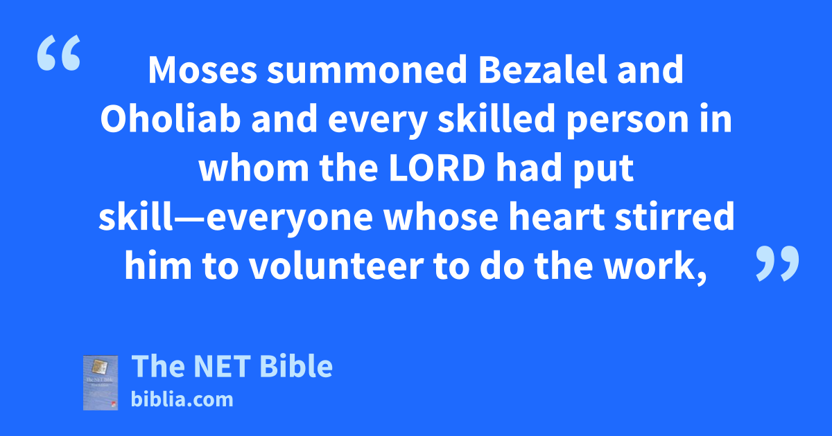 36:2 Moses summoned7 Bezalel and Oholiab and every skilled person in whom8 the Lord had put skill—everyone whose heart stirred him9 to volunteer10 to do the work, 36:3 and they received from Moses all the offerings the Israelites had brought to do11 the work for the service of the sanctuary, and they still continued to bring him a freewill offering each morning.12 36:4 So all the skilled people who were doing all the work on the sanctuary came from the work13 they were doing 36:5 and told Moses, “The people are bringing much more than14 is needed for the completion15 of the work which the Lord commanded us to do!”16