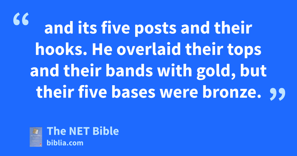 36:37 He made a hanging for the entrance of the tent of blue, purple, and scarlet yarn and fine twisted linen, the work of an embroiderer, 36:38 and its five posts and their hooks. He overlaid their tops42 and their bands with gold, but their five bases were bronze.43