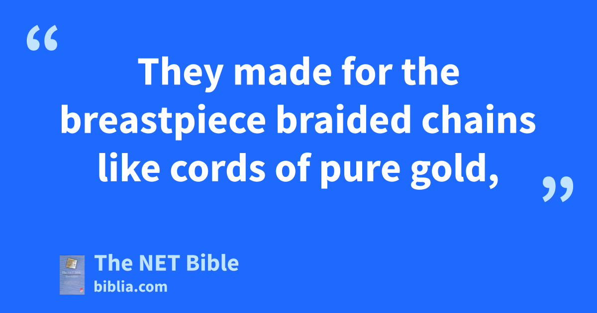 39:15 They made for the breastpiece braided chains like cords of pure gold, 39:16 and they made two gold filigree settings and two gold rings, and they attached the two rings to the upper9 two ends of the breastpiece. 39:17 They attached the two gold chains to the two rings at the ends of the breastpiece; 39:18 the other10 two ends of the two chains they attached to the two settings, and they attached them to the shoulder pieces of the ephod at the front of it. 39:19 They made two rings of gold and put them on the other11 two ends of the breastpiece on its edge, which is on the inner side of the ephod.12 39:20 They made two more13 gold rings and attached them to the bottom of the two shoulder pieces on the front of the ephod, close to the juncture above the waistband of the ephod. 39:21 They tied the breastpiece by its rings to the rings of the ephod by blue cord, so that it was above the waistband of the ephod, so that the breastpiece would not be loose from the ephod, just as the Lord had commanded Moses.
