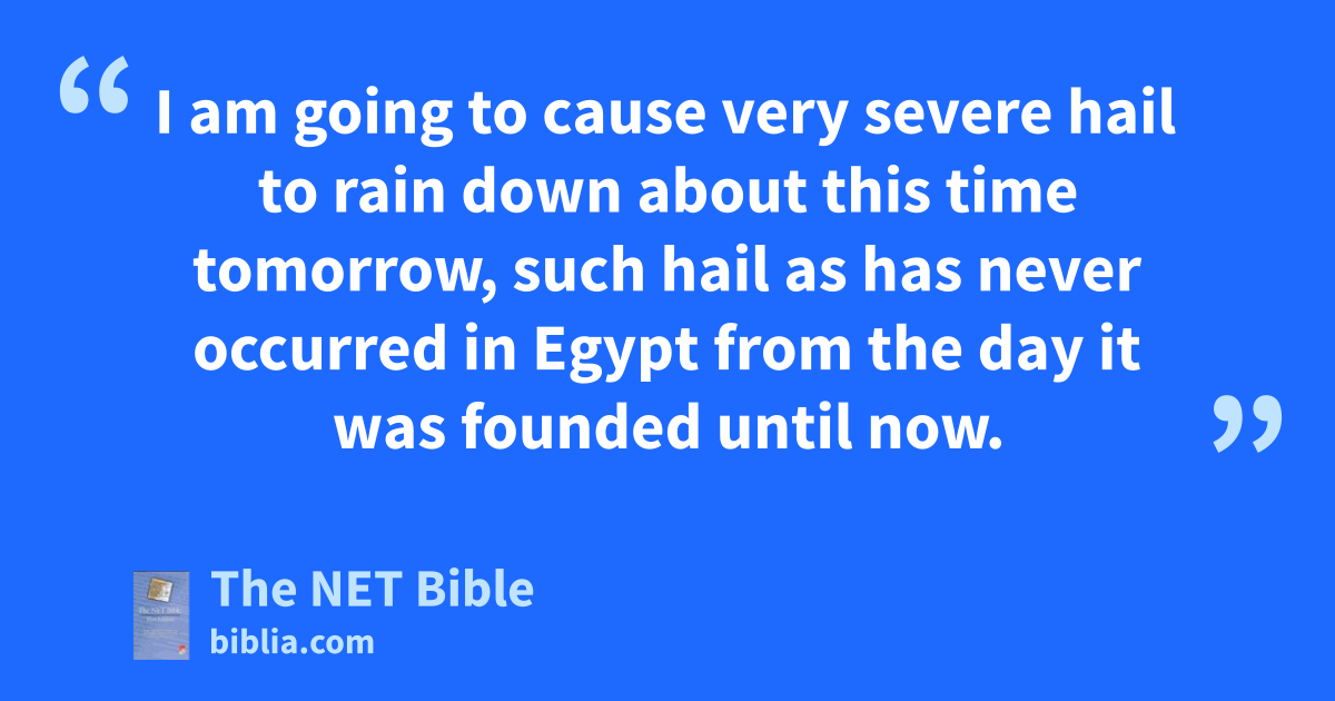 9:13 24 The Lord said25 to Moses, “Get up early in the morning, stand26 before Pharaoh, and tell him, ‘Thus says the Lord, the God of the Hebrews: “Release my people so that they may serve me! 9:14 For this time I will send all my plagues27 on your very self28 and on your servants and your people, so that you may know that there is no one like me in all the earth. 9:15 For by now I could have stretched out29 my hand and struck you and your people with plague, and you would have been destroyed30 from the earth. 9:16 But31 for this purpose I have caused you to stand:32 to show you33 my strength, and so that my name may be declared34 in all the earth. 9:17 You are still exalting35 yourself against my people by36 not releasing them. 9:18 I am going to cause very severe hail to rain down37 about this time tomorrow, such hail as has never occurred38 in Egypt from the day it was founded39 until now. 9:19 So now, send instructions40 to gather41 your livestock and all your possessions in the fields to a safe place. Every person42 or animal caught43 in the field and not brought into the house—the hail will come down on them, and they will die!” ’ ”