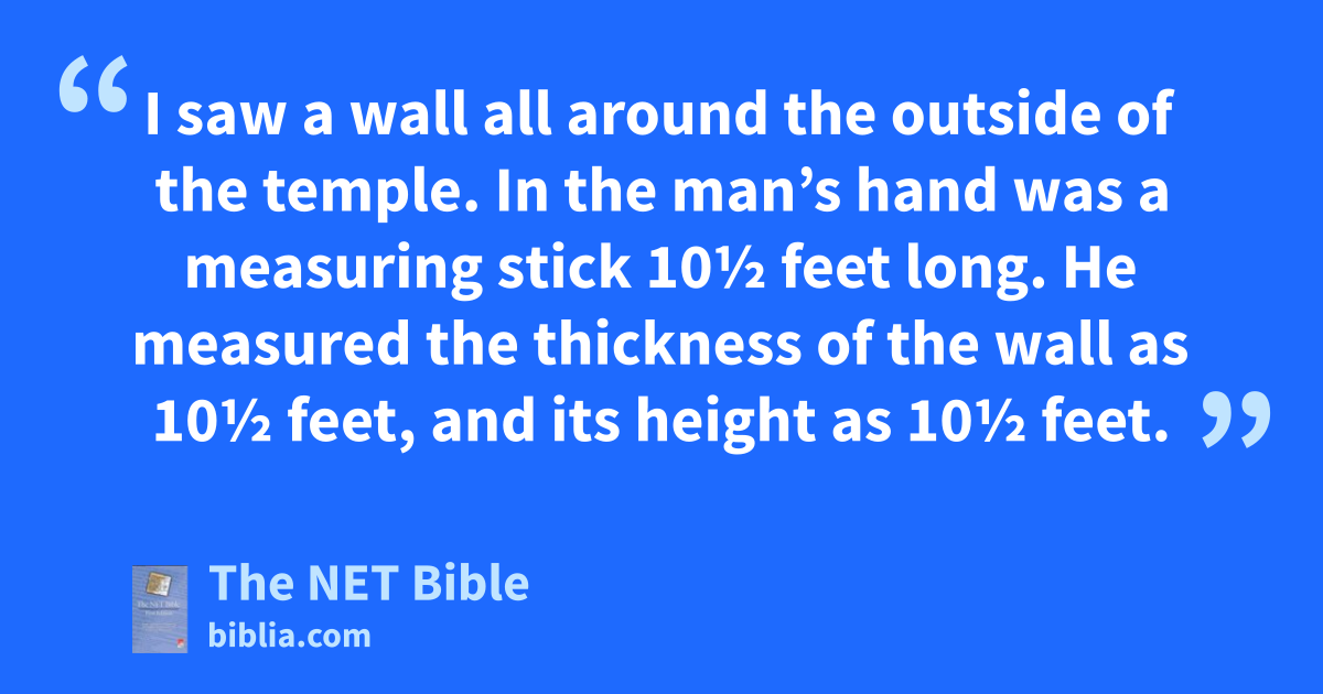 40:5 I saw10 a wall all around the outside of the temple.11 In the man’s hand was a measuring stick 10½ feet12 long. He measured the thickness of the wall13 as 10½ feet,14 and its height as 10½ feet. 40:6 Then he went to the gate facing east. He climbed its steps and measured the threshold of the gate as 10½ feet deep.15 40:7 The alcoves were 10½ feet long and 10½ feet wide; between the alcoves were 8¾ feet.16 The threshold of the gate by the porch of the gate facing inward was 10½ feet. 40:8 Then he measured the porch of the gate facing inward as 10½ feet. 40:9 He measured the porch of the gate as 14 feet,17 and its jambs as 3½ feet;18 the porch of the gate faced inward. 40:10 There were three alcoves on each side of the east gate; the three had the same measurement, and the jambs on either side had the same measurement.19 40:11 He measured the width of the entrance of the gateway as 17½ feet,20 and the length of the gateway as 22¾ feet.21 40:12 There was a barrier in front of the alcoves, 1¾ feet22 on either side; the alcoves were 10½ feet23 on either side. 40:13 He measured the gateway from the roof of one alcove to the roof of the other, a width of 43¾ feet24 from one entrance to the opposite one. 40:14 He measured25 the porch26 at 105 feet27 high;28 the gateway went all around to the jamb of the courtyard. 40:15 From the front of the entrance gate to the porch of the inner gate was 87½ feet.29 40:16 There were closed windows toward the alcoves and toward their jambs within the gate all around, and likewise for the porches. There were windows all around the inside, and on each jamb were decorative palm trees.30