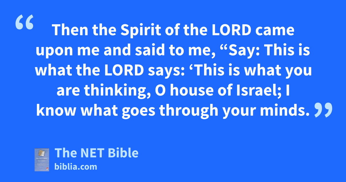 11:5 Then the Spirit of the Lord came8 upon me and said to me, “Say: This is what the Lord says: ‘This is what you are thinking,9 O house of Israel; I know what goes through your minds.10 11:6 You have killed many people in this city; you have filled its streets with corpses.’ 11:7 Therefore, this is what the sovereign Lord says: ‘The corpses you have dumped11 in the midst of the city12 are the meat, and this city13 is the cooking pot, but I will take you out of it.14 11:8 You fear the sword, so the sword I will bring against you,’ declares the sovereign Lord. 11:9 ‘But I will take you out of the city.15 And I will hand you over to foreigners. I will execute judgments on you. 11:10 You will die by the sword; I will judge you at the border of Israel. Then you will know that I am the Lord. 11:11 This city will not be a cooking pot for you, and you will not16 be meat within it; I will judge you at the border of Israel. 11:12 Then you will know that I am the Lord, whose statutes you have not followed and whose regulations you have not carried out. Instead you have behaved according to the regulations of the nations around you!’ ”