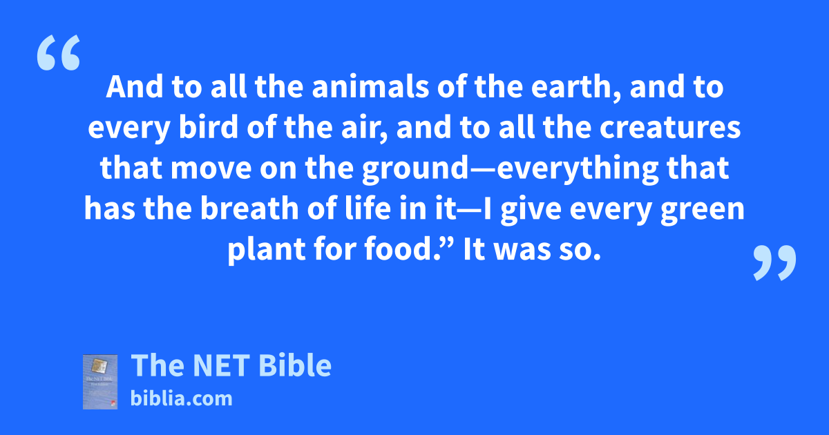 1:28 God blessed56 them and said57 to them, “Be fruitful and multiply! Fill the earth and subdue it!58 Rule over the fish of the sea and the birds of the air and every creature that moves on the ground.”59 1:29 Then God said, “I now60 give you every seed-bearing plant on the face of the entire earth and every tree that has fruit with seed in it. They will be yours for food.61 1:30 And to all the animals of the earth, and to every bird of the air, and to all the creatures that move on the ground—everything that has the breath of life in it—I give62 every green plant for food.” It was so.