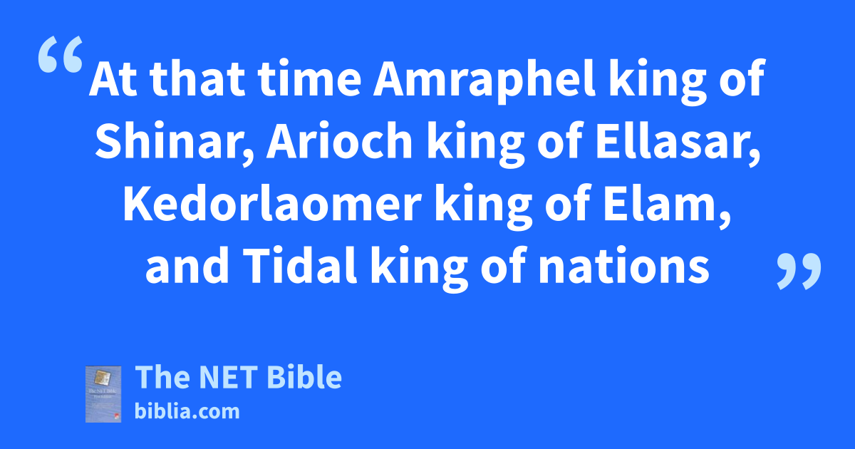 14:1 At that time1 Amraphel king of Shinar,2 Arioch king of Ellasar, Kedorlaomer king of Elam, and Tidal king of nations3 14:2 went to war4 against Bera king of Sodom, Birsha king of Gomorrah, Shinab king of Admah, Shemeber king of Zeboiim, and the king of Bela (that is, Zoar).5 14:3 These last five kings6 joined forces7 in the Valley of Siddim (that is, the Salt Sea).8 14:4 For twelve years9 they had served Kedorlaomer, but in the thirteenth year10 they rebelled.11 14:5 In the fourteenth year, Kedorlaomer and the kings who were his allies came and defeated12 the Rephaites in Ashteroth Karnaim, the Zuzites in Ham, the Emites in Shaveh Kiriathaim, 14:6 and the Horites in their hill country of Seir, as far as El Paran, which is near the desert.13 14:7 Then they attacked En Mishpat (that is, Kadesh) again,14 and they conquered all the territory of the Amalekites, as well as the Amorites who were living in Hazazon Tamar.