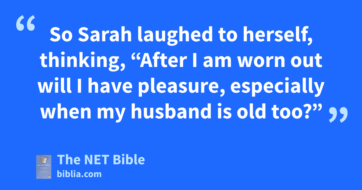 18:9 Then they asked him, “Where is Sarah your wife?” He replied, “There,28 in the tent.” 18:10 One of them29 said, “I will surely return30 to you when the season comes round again,31 and your wife Sarah will have a son!”32 (Now Sarah was listening at the entrance to the tent, not far behind him.33 18:11 Abraham and Sarah were old and advancing in years;34 Sarah had long since passed menopause.)35 18:12 So Sarah laughed to herself, thinking,36 “After I am worn out will I have pleasure,37 especially when my husband is old too?”38