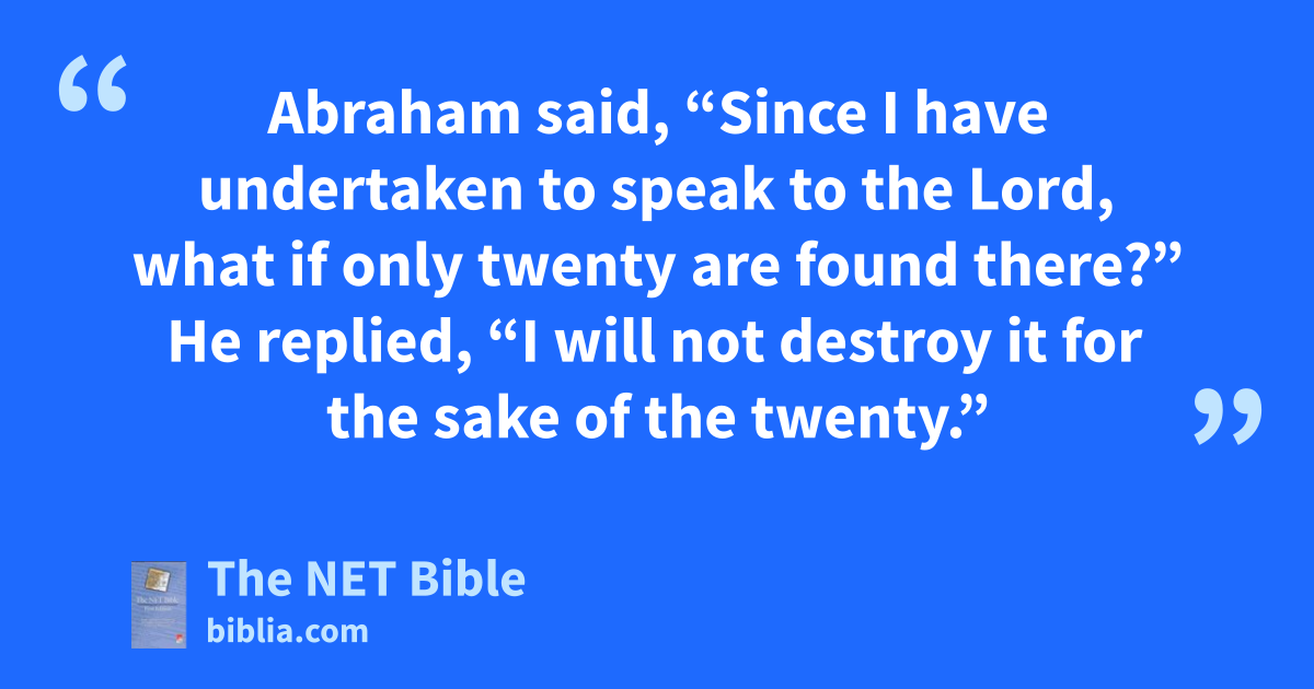 18:31 Abraham77 said, “Since I have undertaken to speak to the Lord, what if only twenty are found there?” He replied, “I will not destroy it for the sake of the twenty.”