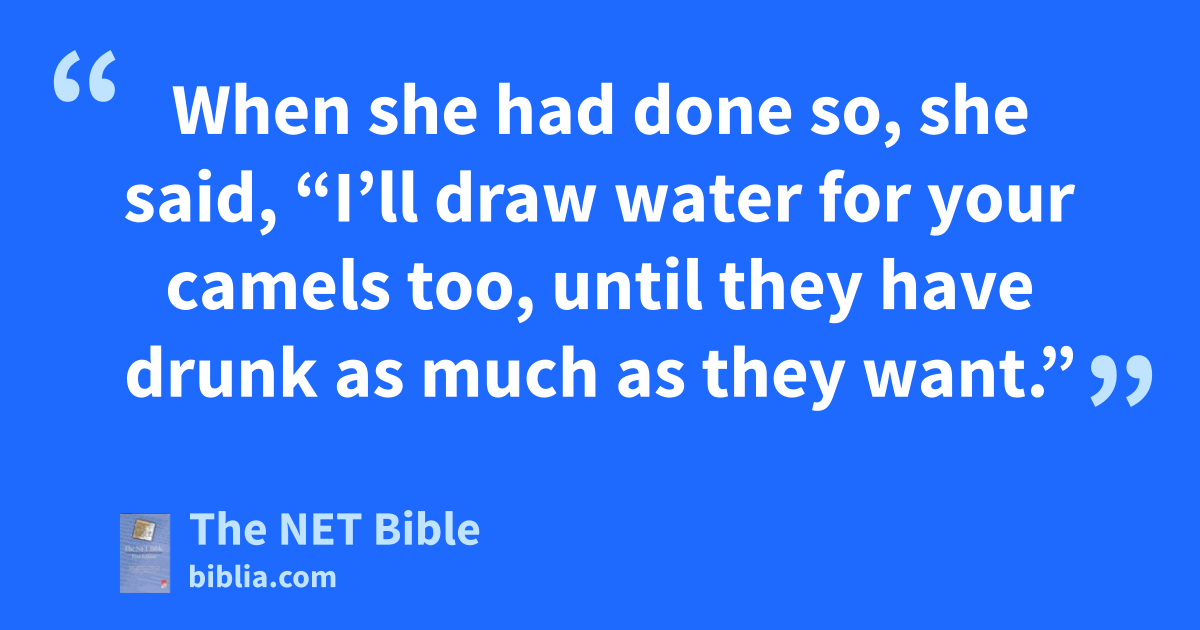 24:15 Before he had finished praying, there came Rebekah31 with her water jug on her shoulder. She was the daughter of Bethuel son of Milcah (Milcah was the wife of Abraham’s brother Nahor).32 24:16 Now the young woman was very beautiful. She was a virgin; no man had ever had sexual relations with her.33 She went down to the spring, filled her jug, and came back up. 24:17 Abraham’s servant34 ran to meet her and said, “Please give me a sip of water from your jug.” 24:18 “Drink, my lord,” she replied, and quickly lowering35 her jug to her hands, she gave him a drink. 24:19 When she had done so,36 she said, “I’ll draw water for your camels too, until they have drunk as much as they want.” 24:20 She quickly emptied37 her jug into the watering trough and ran back to the well to draw more water until she had drawn enough for all his camels. 24:21 Silently the man watched her with interest to determine38 if the Lord had made his journey successful39 or not.