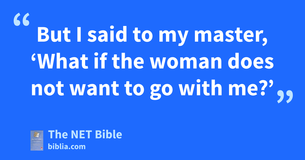 24:34 “I am the servant of Abraham,” he began. 24:35 “The Lord has richly blessed my master and he has become very wealthy.66 The Lord67 has given him sheep and cattle, silver and gold, male and female servants, and camels and donkeys. 24:36 My master’s wife Sarah bore a son to him68 when she was old,69 and my master70 has given him everything he owns. 24:37 My master made me swear an oath. He said, ‘You must not acquire a wife for my son from the daughters of the Canaanites, among whom I am living, 24:38 but you must go to the family of my father and to my relatives to find71 a wife for my son.’ 24:39 But I said to my master, ‘What if the woman does not want to go72 with me?’73 24:40 He answered, ‘The Lord, before whom I have walked,74 will send his angel with you. He will make your journey a success and you will find a wife for my son from among my relatives, from my father’s family. 24:41 You will be free from your oath75 if you go to my relatives and they will not give her to you. Then you will be free from your oath.’ 24:42 When I came to the spring today, I prayed, ‘O Lord, God of my master Abraham, if you have decided to make my journey successful,76 may events unfold as follows:77 24:43 Here I am, standing by the spring.78 When79 the young woman goes out to draw water, I’ll say, “Give me a little water to drink from your jug.” 24:44 Then she will reply to me, “Drink, and I’ll draw water for your camels too.” May that woman be the one whom the Lord has chosen for my master’s son.’