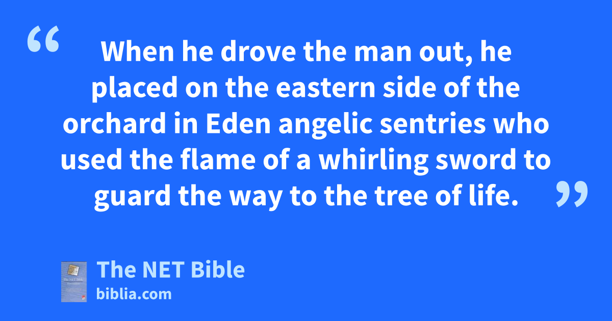 3:20 The man59 named his wife Eve,60 because61 she was the mother of all the living.62 3:21 The Lord God made garments from skin63 for Adam and his wife, and clothed them. 3:22 And the Lord God said, “Now64 that the man has become like one of us,65 knowing66 good and evil, he must not be allowed67 to stretch out his hand and take also from the tree of life and eat, and live forever.” 3:23 So the Lord God expelled him68 from the orchard in Eden to cultivate the ground from which he had been taken. 3:24 When he drove69 the man out, he placed on the eastern side70 of the orchard in Eden angelic sentries71 who used the flame of a whirling sword72 to guard the way to the tree of life.