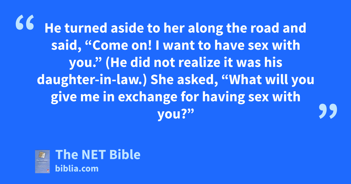 38:15 When Judah saw her, he thought she was a prostitute30 because she had covered her face. 38:16 He turned aside to her along the road and said, “Come on! I want to have sex with you.”31 (He did not realize32 it was his daughter-in-law.) She asked, “What will you give me in exchange for having sex with you?”33 38:17 He replied, “I’ll send you a young goat from the flock.” She asked, “Will you give me a pledge until you send it?”34 38:18 He said, “What pledge should I give you?” She replied, “Your seal, your cord, and the staff that’s in your hand.” So he gave them to her and had sex with her.35 She became pregnant by him. 38:19 She left immediately,36 removed her veil, and put on her widow’s clothes.
