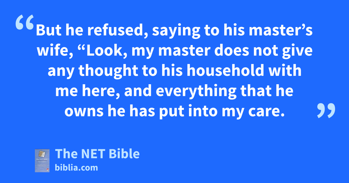Now Joseph was well built and good-looking.20 39:7 Soon after these things, his master’s wife took notice of21 Joseph and said, “Have sex with me.”22 39:8 But he refused, saying23 to his master’s wife, “Look, my master does not give any thought24 to his household with me here,25 and everything that he owns he has put into my care.26 39:9 There is no one greater in this household than I am. He has withheld nothing from me except you because you are his wife. So how could I do27 such a great evil and sin against God?” 39:10 Even though she continued to speak28 to Joseph day after day, he did not respond29 to her invitation to have sex with her.30