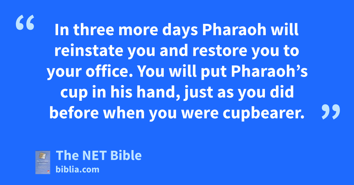 40:12 “This is its meaning,” Joseph said to him. “The three branches represent17 three days. 40:13 In three more days Pharaoh will reinstate you18 and restore you to your office. You will put Pharaoh’s cup in his hand, just as you did before19 when you were cupbearer. 40:14 But remember me20 when it goes well for you, and show21 me kindness.22 Make mention23 of me to Pharaoh and bring me out of this prison,24 40:15 for I really was kidnapped25 from the land of the Hebrews and I have done nothing wrong here for which they should put me in a dungeon.”