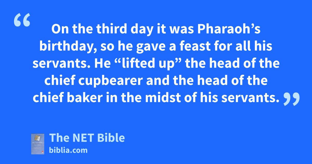 40:20 On the third day it was Pharaoh’s birthday, so he gave a feast for all his servants. He “lifted up”30 the head of the chief cupbearer and the head of the chief baker in the midst of his servants. 40:21 He restored the chief cupbearer to his former position31 so that he placed the cup in Pharaoh’s hand, 40:22 but the chief baker he impaled, just as Joseph had predicted.32 40:23 But the chief cupbearer did not remember Joseph—he forgot him.33