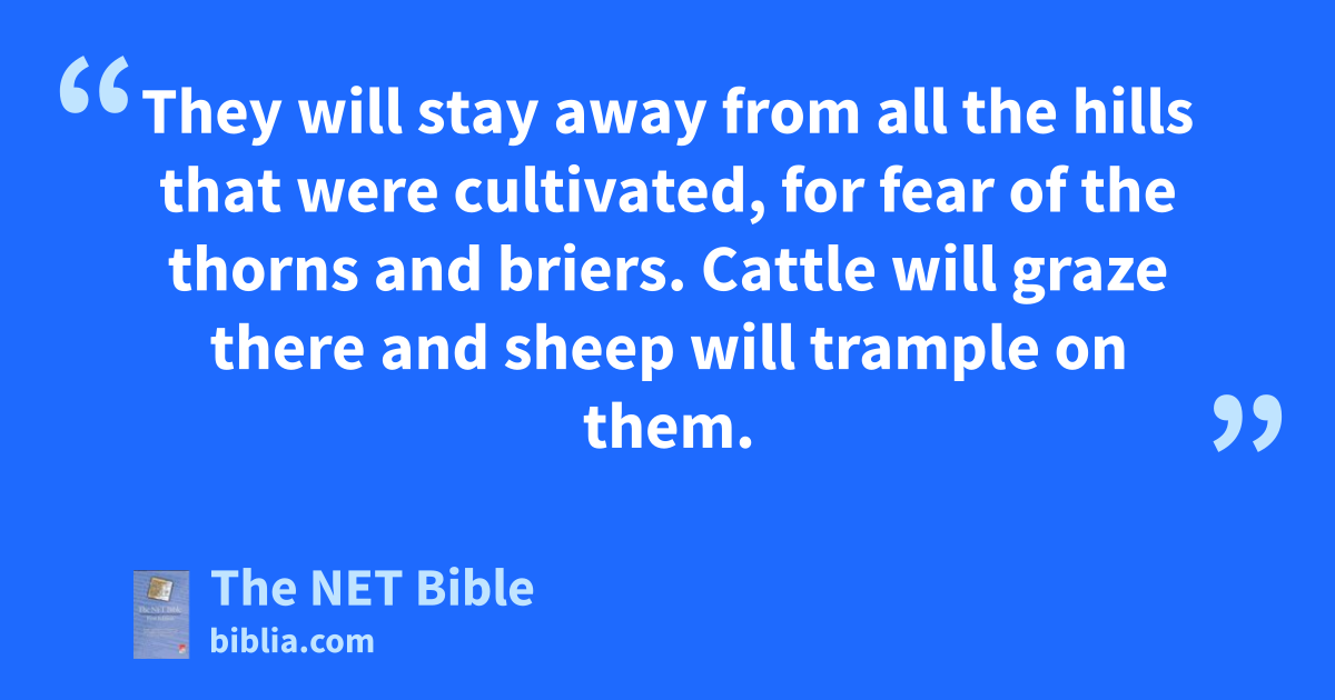 7:18 At that time37 the Lord will whistle for flies from the distant streams of Egypt and for bees from the land of Assyria.38 7:19 All of them will come and make their home39 in the ravines between the cliffs, and in the crevices of the cliffs, in all the thorn bushes, and in all the watering holes.40 7:20 At that time41 the sovereign master will use a razor hired from the banks of the Euphrates River,42 the king of Assyria, to shave the head and the pubic hair;43 it will also shave off the beard. 7:21 At that time44 a man will keep alive a young cow from the herd and a couple of goats. 7:22 From the abundance of milk they produce,45 he will have sour milk for his meals. Indeed, everyone left in the heart of the land will eat sour milk and honey. 7:23 At that time46 every place where there had been a thousand vines worth a thousand shekels will be overrun47 with thorns and briers. 7:24 With bow and arrow48 men will hunt49 there, for the whole land will be covered50 with thorns and briers. 7:25 They will stay away from all the hills that were cultivated, for fear of the thorns and briers.51 Cattle will graze there and sheep will trample on them.52