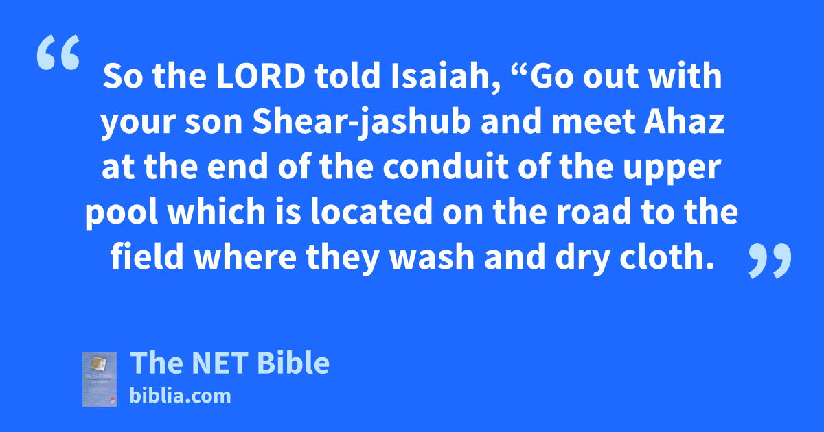 7:2 It was reported to the family4 of David, “Syria has allied with5 Ephraim.” They and their people were emotionally shaken, just as the trees of the forest shake before the wind.6 7:3 So the Lord told Isaiah, “Go out with your son Shear-jashub7 and meet Ahaz at the end of the conduit of the upper pool which is located on the road to the field where they wash and dry cloth.8 7:4 Tell him, ‘Make sure you stay calm!9 Don’t be afraid! Don’t be intimidated10 by these two stubs of smoking logs,11 or by the raging anger of Rezin, Syria, and the son of Remaliah. 7:5 Syria has plotted with Ephraim and the son of Remaliah to bring about your demise.12 7:6 They say, “Let’s attack Judah, terrorize it, and conquer it.13 Then we’ll set up the son of Tabeel as its king.”14 7:7 For this reason the sovereign master,15 the Lord, says:
