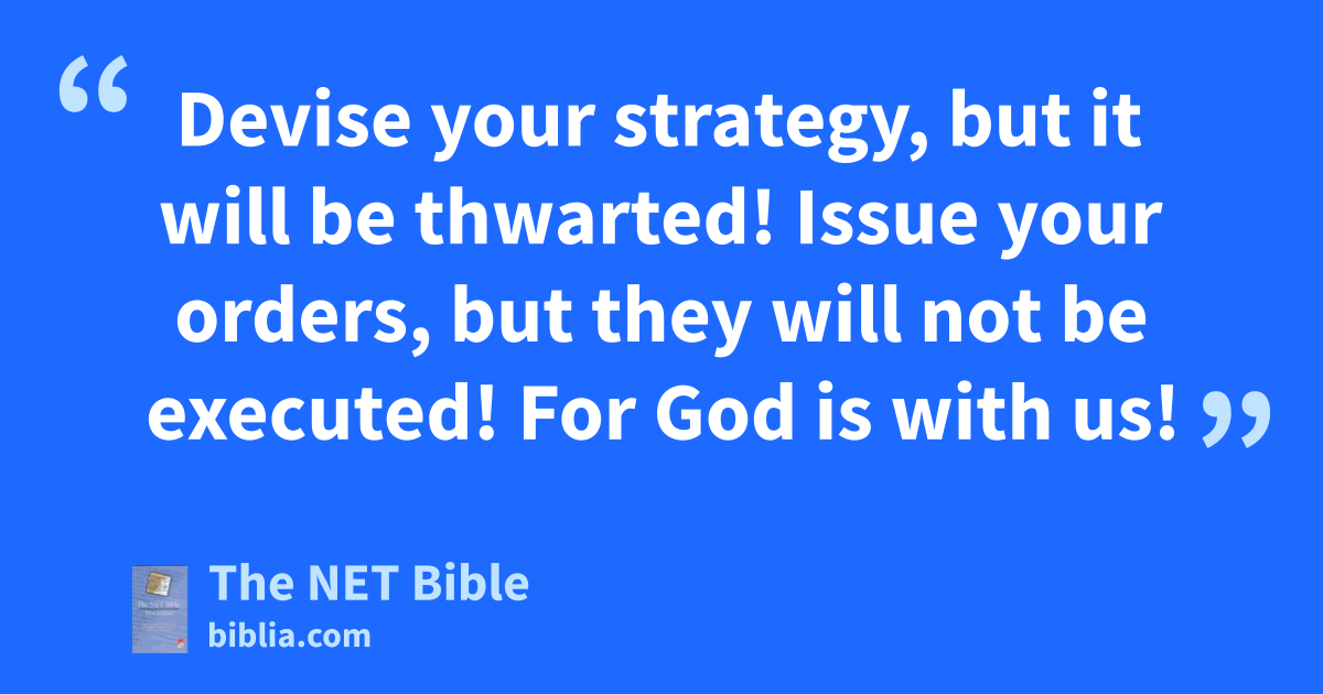 8:5 The Lord spoke to me again: 8:6 “These people8 have rejected the gently flowing waters of Shiloah9 and melt in fear over Rezin and the son of Remaliah.10 8:7 So look, the sovereign master11 is bringing up against them the turbulent and mighty waters of the Euphrates River12—the king of Assyria and all his majestic power. It will reach flood stage and overflow its banks.13 8:8 It will spill into Judah, flooding and engulfing, as it reaches to the necks of its victims. He will spread his wings out over your entire land,14 O Immanuel.”15