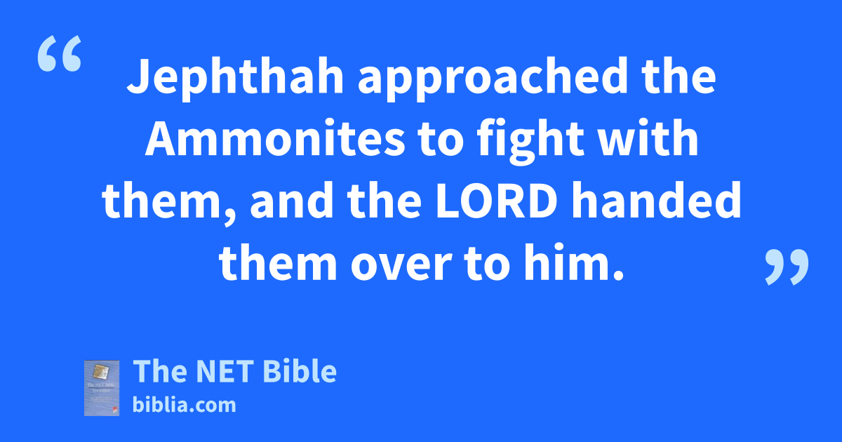 11:29 The Lord’s spirit empowered49 Jephthah. He passed through Gilead and Manasseh and went50 to Mizpah in Gilead. From there he approached the Ammonites.51 11:30 Jephthah made a vow to the Lord, saying, “If you really do hand the Ammonites over to me, 11:31 then whoever is the first to come through52 the doors of my house to meet me when I return safely from fighting the Ammonites—he53 will belong to the Lord and54 I will offer him up as a burnt sacrifice.” 11:32 Jephthah approached55 the Ammonites to fight with them, and the Lord handed them over to him. 11:33 He defeated them from Aroer all the way to Minnith—twenty cities in all, even as far as Abel Keramim! He wiped them out!56 The Israelites humiliated the Ammonites.57