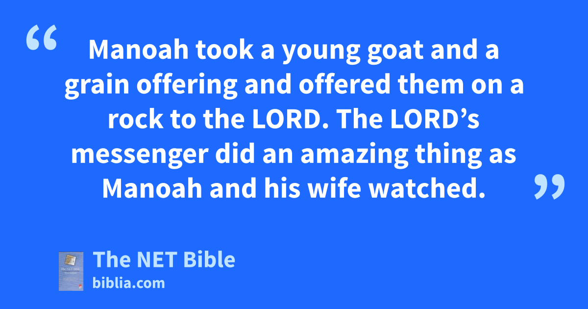 13:8 Manoah prayed to the Lord,16 “Please, Lord, allow the man sent from God17 to visit18 us again, so he can teach19 us how we should raise20 the child who will be born.” 13:9 God answered Manoah’s prayer.21 God’s angelic messenger visited22 the woman again while she was sitting in the field. But her husband Manoah was not with her. 13:10 The woman ran at once and told her husband,23 “Come quickly,24 the man who visited25 me the other day has appeared to me!” 13:11 So Manoah got up and followed his wife. When he met26 the man, he said to him, “Are you the man who spoke to my wife?”27 He said, “Yes.”28 13:12 Manoah said, “Now, when your announcement comes true,29 how should the child be raised and what should he do?”30 13:13 The Lord’s messenger told31 Manoah, “Your wife should pay attention to everything I told her.32 13:14 She should not drink33 anything that the grapevine produces. She must not drink wine or beer, and she must not eat any food that will make her ritually unclean.34 She should obey everything I commanded her to do.” 13:15 Manoah said to the Lord’s messenger, “Please stay here awhile,35 so we can prepare a young goat for you to eat.”36 13:16 The Lord’s messenger said to Manoah, “If I stay,37 I will not eat your food. But if you want to make a burnt sacrifice to the Lord, you should offer it.” (He said this because Manoah did not know that he was the Lord’s messenger.)38 13:17 Manoah said to the Lord’s messenger, “Tell us your name, so we can honor you when your announcement comes true.”39 13:18 The Lord’s messenger said to him, “You should not ask me my name, because you cannot comprehend it.”40 13:19 Manoah took a young goat and a grain offering and offered them on a rock to the Lord. The Lord’s messenger did an amazing thing as Manoah and his wife watched.41 13:20 As the flame went up from the altar toward the sky, the Lord’s messenger went up in it42 while Manoah and his wife watched. They fell facedown43 to the ground.
