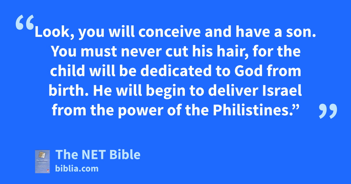 13:2 There was a man named Manoah from Zorah, from the Danite tribe. His wife was infertile and childless.2 13:3 The Lord’s angelic3 messenger appeared to the woman and said to her, “You4 are infertile and childless,5 but you will conceive and have a son. 13:4 Now be careful! Do not drink wine or beer, and do not eat any food that will make you ritually unclean.6 13:5 Look, you will conceive and have a son.7 You must never cut his hair,8 for the child will be dedicated to God9 from birth. He will begin to deliver Israel from the power10 of the Philistines.”