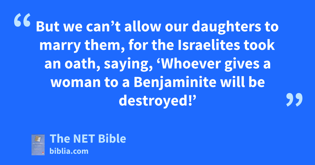 21:1 The Israelites had taken an oath in Mizpah, saying, “Not one of us will allow his daughter to marry a Benjaminite.” 21:2 So the people came to Bethel1 and sat there before God until evening, weeping loudly and uncontrollably.2 21:3 They said, “Why, O Lord God of Israel, has this happened in Israel?” An entire3 tribe has disappeared from Israel today!”