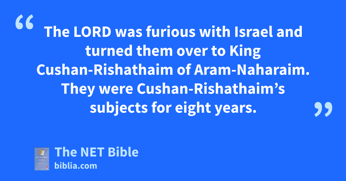 3:7 The Israelites did evil in the Lord’s sight.8 They forgot the Lord their God and worshiped the Baals and the Asherahs.9 3:8 The Lord was furious with Israel10 and turned them over to11 King Cushan-Rishathaim12 of Aram-Naharaim. They were Cushan-Rishathaim’s subjects13 for eight years. 3:9 When the Israelites cried out for help to the Lord, he14 raised up a deliverer for the Israelites who rescued15 them. His name was Othniel son of Kenaz, Caleb’s younger brother.16 3:10 The Lord’s spirit empowered him17 and he led Israel. When he went to do battle, the Lord handed over to him King Cushan-Rishathaim of Aram and he overpowered him.18 3:11 The land had rest for forty years; then Othniel son of Kenaz died.