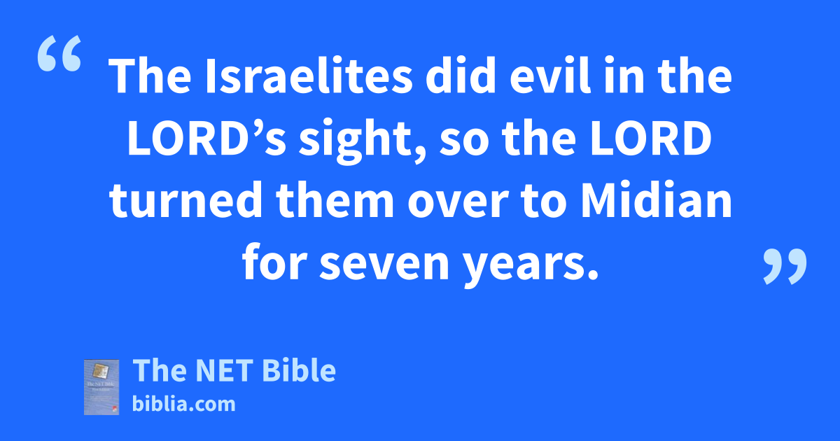 6:1 The Israelites did evil in the Lord’s sight,1 so the Lord turned them over to2 Midian for seven years. 6:2 The Midianites3 overwhelmed Israel.4 Because of Midian the Israelites made shelters5 for themselves in the hills, as well as caves and strongholds. 6:3 Whenever the Israelites planted their crops,6 the Midianites, Amalekites, and the people from the east would attack them.7 6:4 They invaded the land8 and devoured9 its crops10 all the way to Gaza. They left nothing for the Israelites to eat,11 and they took away12 the sheep, oxen, and donkeys. 6:5 When they invaded13 with their cattle and tents, they were as thick14 as locusts. Neither they nor their camels could be counted.15 They came to devour16 the land. 6:6 Israel was so severely weakened by Midian that the Israelites cried out to the Lord for help.