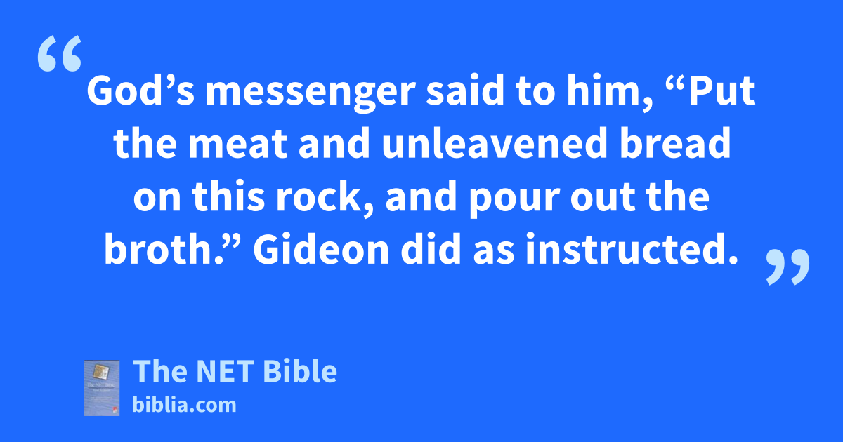 6:19 Gideon went and prepared a young goat,46 along with unleavened bread made from an ephah of flour. He put the meat in a basket and the broth in a pot. He brought the food47 to him under the oak tree and presented it to him. 6:20 God’s messenger said to him, “Put the meat and unleavened bread on this rock,48 and pour out the broth.” Gideon did as instructed.49 6:21 The Lord’s messenger touched the meat and the unleavened bread with the tip of his staff.50 Fire flared up from the rock and consumed the meat and unleavened bread. The Lord’s messenger then disappeared.51