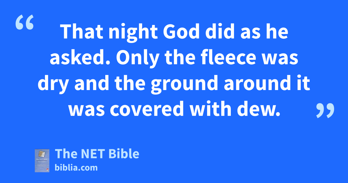 6:36 Gideon said to God, “If you really intend to use me to deliver Israel,82 as you promised, then give me a sign as proof.83 6:37 Look, I am putting a wool fleece on the threshing floor. If there is dew only on the fleece, and the ground around it84 is dry, then I will be sure85 that you will use me to deliver Israel,86 as you promised.” 6:38 The Lord did as he asked.87 When he got up the next morning, he squeezed the fleece, and enough dew dripped from it to fill a bowl.88 6:39 Gideon said to God, “Please do not get angry at me, when I ask for just one more sign.89 Please allow me one more test with the fleece. This time make only the fleece dry, while the ground around it is covered with dew.”90 6:40 That night God did as he asked.91 Only the fleece was dry and the ground around it was covered with dew.