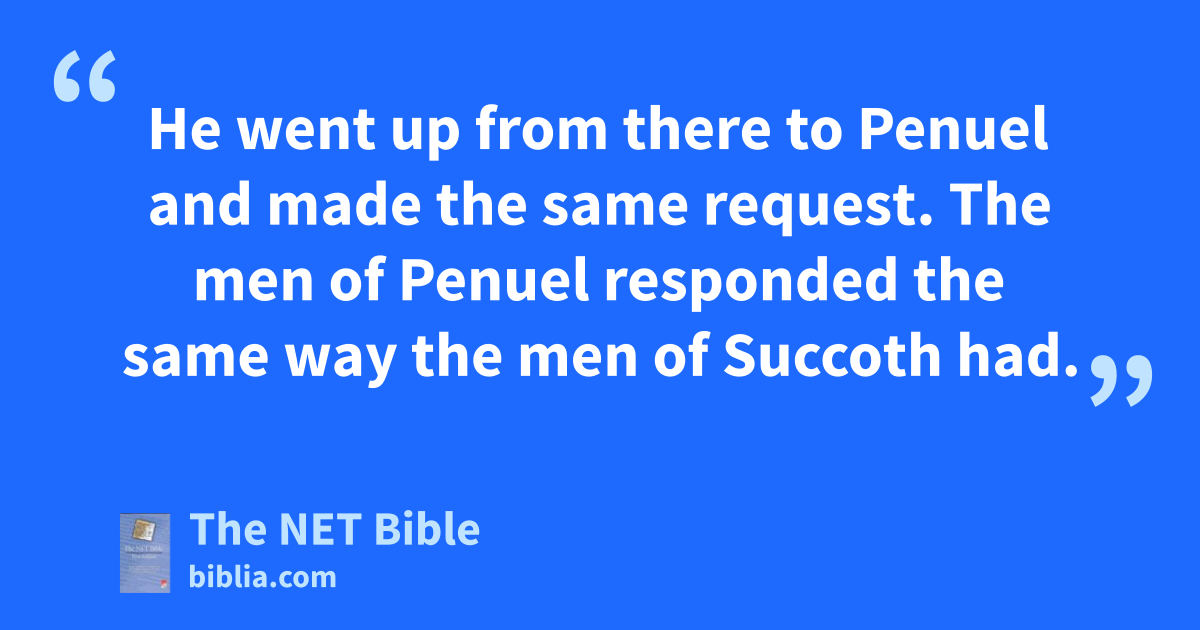 8:4 Now Gideon and his three hundred men had crossed over the Jordan River, and even though they were exhausted, they were still chasing the Midianites.6 8:5 He said to the men of Succoth, “Give7 some loaves of bread to the men8 who are following me,9 because they are exhausted. I am chasing Zebah and Zalmunna, the kings of Midian.” 8:6 The officials of Succoth said, “You have not yet overpowered Zebah and Zalmunna. So why should we give10 bread to your army?”11 8:7 Gideon said, “Since you will not help,12 after the Lord hands Zebah and Zalmunna over to me, I will thresh13 your skin14 with15 desert thorns and briers.” 8:8 He went up from there to Penuel and made the same request.16 The men of Penuel responded the same way the men of Succoth had.17 8:9 He also threatened18 the men of Penuel, warning,19 “When I return victoriously,20 I will tear down this tower.”