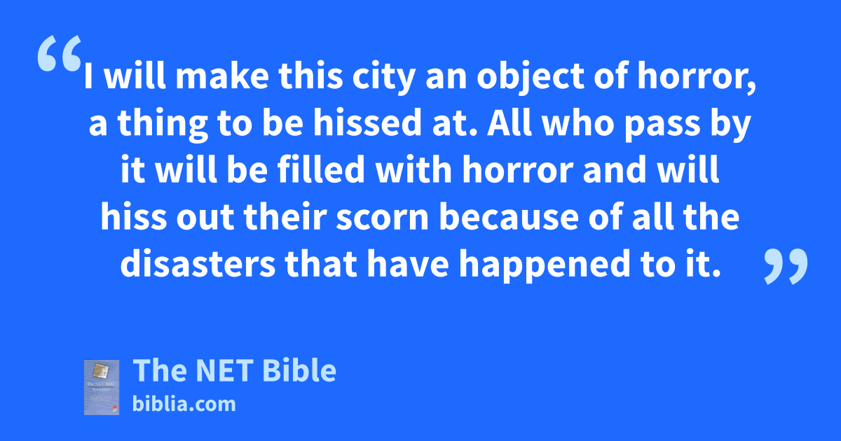 19:1 The Lord told Jeremiah,1 “Go and buy a clay jar from a potter.2 Take with you3 some of the leaders of the people and some of the leaders4 of the priests. 19:2 Go out to the part of the Hinnom Valley which is near the entrance of the Potsherd Gate.5 Announce there what I tell you.6 19:3 Say, ‘Listen to what the Lord says, you kings of Judah and citizens of Jerusalem!7 The Lord God of Israel who rules over all8 says, “I will bring a disaster on this place9 that will make the ears of everyone who hears about it ring!10 19:4 I will do so because these people11 have rejected me and have defiled12 this place. They have offered sacrifices in it to other gods which neither they nor their ancestors13 nor the kings of Judah knew anything about. They have filled it with the blood of innocent children.14 19:5 They have built places here15 for worship of the god Baal so that they could sacrifice their children as burnt offerings to him in the fire. Such sacrifices16 are something I never commanded them to make! They are something I never told them to do! Indeed, such a thing never even entered my mind! 19:6 So I, the Lord, say:17 “The time will soon come that people will no longer call this place Topheth or the Hinnom Valley. But they will call this valley18 the Valley of Slaughter! 19:7 In this place I will thwart19 the plans of the people of Judah and Jerusalem. I will deliver them over to the power of their enemies who are seeking to kill them. They will die by the sword20 at the hands of their enemies.21 I will make their dead bodies food for the birds and wild beasts to eat. 19:8 I will make this city an object of horror, a thing to be hissed at. All who pass by it will be filled with horror and will hiss out their scorn22 because of all the disasters that have happened to it.23 19:9 I will reduce the people of this city to desperate straits during the siege imposed on it by their enemies who are seeking to kill them. I will make them so desperate that they will eat the flesh of their own sons and daughters and the flesh of one another.” ’ ”24