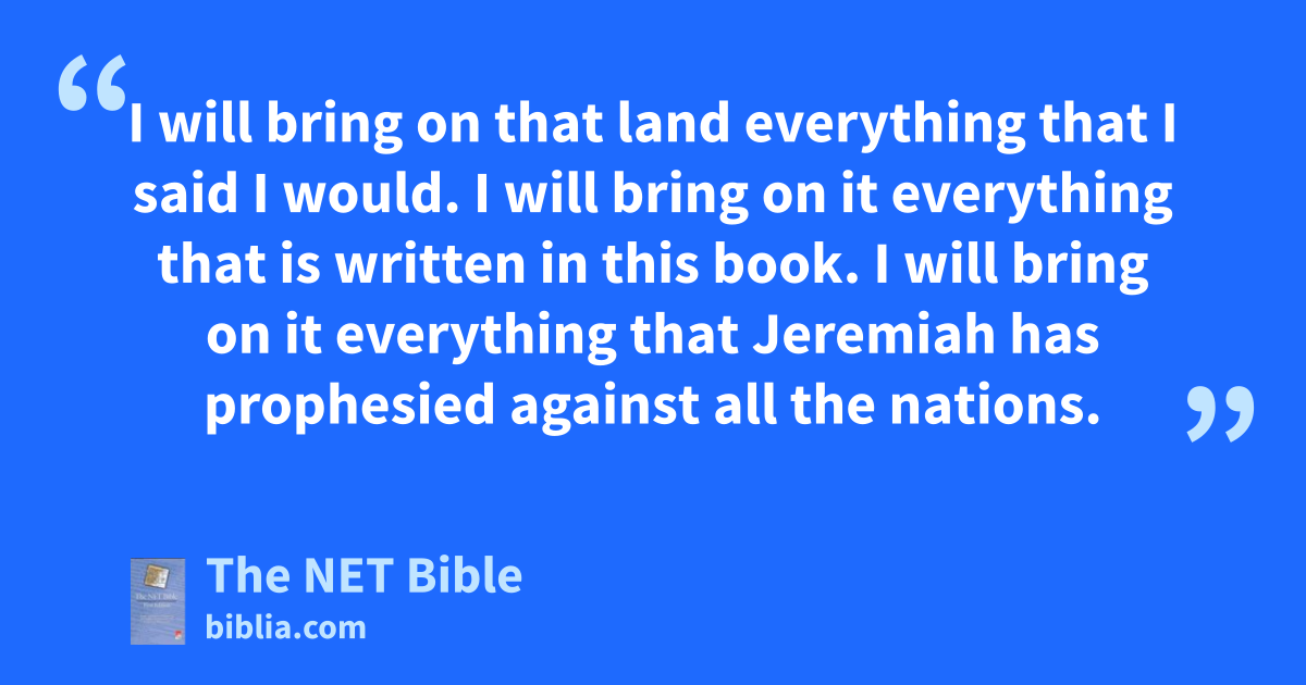 25:12 “ ‘But when the seventy years are over, I will punish the king of Babylon and his nation31 for their sins. I will make the land of Babylon32 an everlasting ruin.33 I, the Lord, affirm it!34 25:13 I will bring on that land everything that I said I would. I will bring on it everything that is written in this book. I will bring on it everything that Jeremiah has prophesied against all the nations.35 25:14 For many nations and great kings will make slaves of the king of Babylon and his nation36 too. I will repay them for all they have done!’ ”37