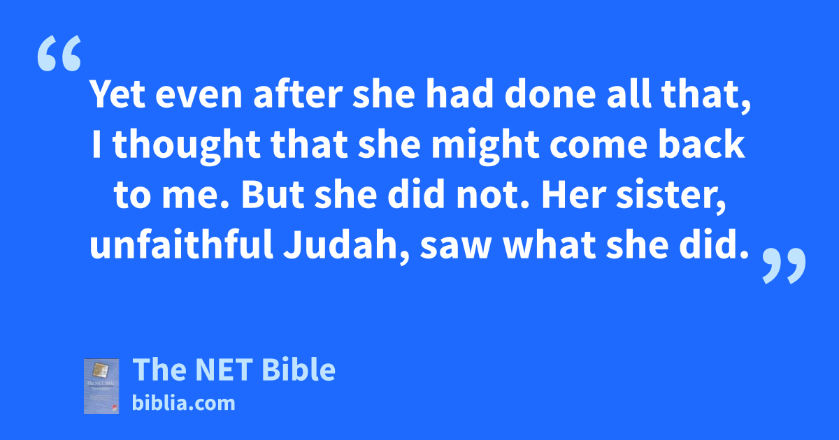 3:6 When Josiah was king of Judah, the Lord said to me, “Jeremiah, you have no doubt seen what wayward Israel has done.13 You have seen how she went up to every high hill and under every green tree to give herself like a prostitute to other gods.14 3:7 Yet even after she had done all that, I thought that she might come back to me.15 But she did not. Her sister, unfaithful Judah, saw what she did.16 3:8 She also saw17 that I gave wayward Israel her divorce papers and sent her away because of her adulterous worship of other gods.18 Even after her unfaithful sister Judah had seen this,19 she still was not afraid, and she too went and gave herself like a prostitute to other gods.20 3:9 Because she took her prostitution so lightly, she defiled the land21 through her adulterous worship of gods made of wood and stone.22 3:10 In spite of all this,23 Israel’s sister, unfaithful Judah, has not turned back to me with any sincerity; she has only pretended to do so,”24 says the Lord. 3:11 Then the Lord said to me, “Under the circumstances, wayward Israel could even be considered less guilty than unfaithful Judah.25