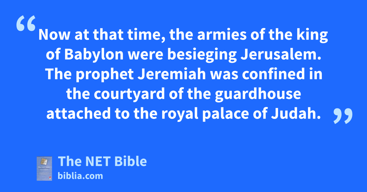 32:2 Now at that time,2 the armies of the king of Babylon were besieging Jerusalem.3 The prophet Jeremiah was confined in the courtyard of the guardhouse4 attached to the royal palace of Judah. 32:3 For King Zedekiah5 had confined Jeremiah there after he had reproved him for prophesying as he did. He had asked Jeremiah, “Why do you keep prophesying these things? Why do you keep saying that the Lord says, ‘I will hand this city over to the king of Babylon? I will let him capture it.6 32:4 King Zedekiah of Judah will not escape from the Babylonians.7 He will certainly be handed over to the king of Babylon. He must answer personally to the king of Babylon and confront him face to face.8 32:5 Zedekiah will be carried off to Babylon and will remain there until I have fully dealt with him.9 I, the Lord, affirm it!10 Even if you11 continue to fight against the Babylonians,12 you cannot win.’ ”