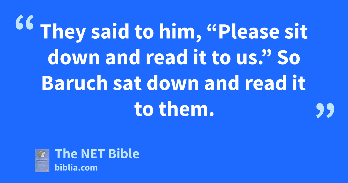 36:11 Micaiah, who was the son of Gemariah and the grandson of Shaphan, heard Baruch read from the scroll everything the Lord had said.21 36:12 He went down to the chamber of the royal secretary in the king’s palace and found all the court officials in session there. Elishama22 the royal secretary, Delaiah son of Shemaiah, Elnathan son of Achbor,23 Gemariah son of Shaphan, Zedekiah son of Hananiah, and all the other officials were seated there. 36:13 Micaiah told them everything he had heard Baruch read from the scroll in the hearing of the people.24 36:14 All the officials sent Jehudi, who was the son of Nethaniah and the grandson of Cushi, to Baruch. They ordered him to tell Baruch, “Come here and bring with you25 the scroll you read in the hearing of the people.”26 So Baruch son of Neriah went to them, carrying the scroll in his hand.27 36:15 They said to him, “Please sit down and read it to us.” So Baruch sat down and read it to them.28 36:16 When they had heard it all,29 they expressed their alarm to one another.30 Then they said to Baruch, “We must certainly give the king a report about everything you have read!”31 36:17 Then they asked Baruch, “How did you come to write all these words? Do they actually come from Jeremiah’s mouth?”32 36:18 Baruch answered, “Yes, they came from his own mouth. He dictated all these words to me and I wrote them down in ink on this scroll.”33 36:19 Then the officials said to Baruch, “You and Jeremiah must go and hide. You must not let anyone know where you are.”34